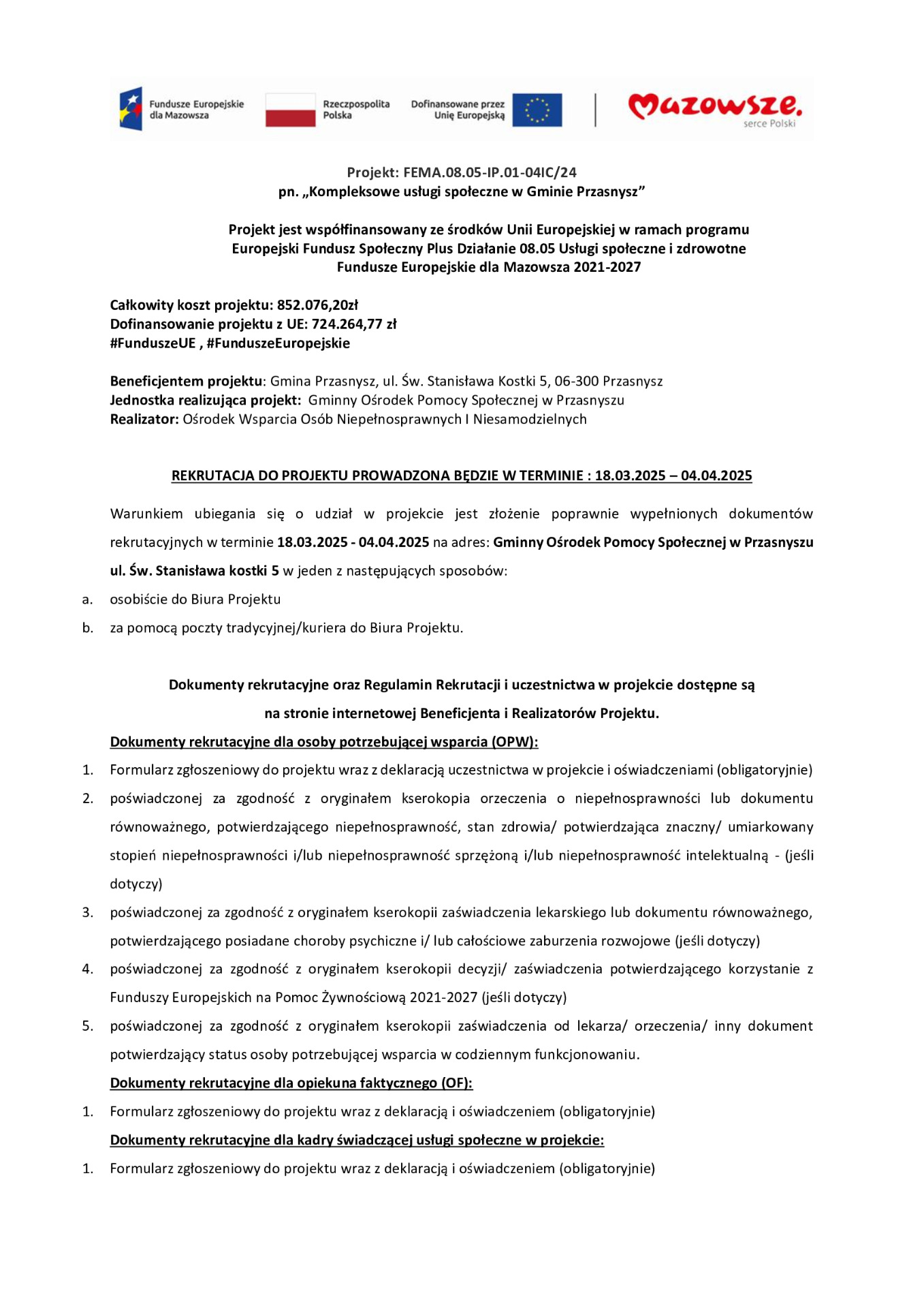 REKRUTACJA DO PROJEKTU ,,KOMPLEKSOWE USŁUGI SPOŁECZNE W GMINIE PRZASNYSZ''.