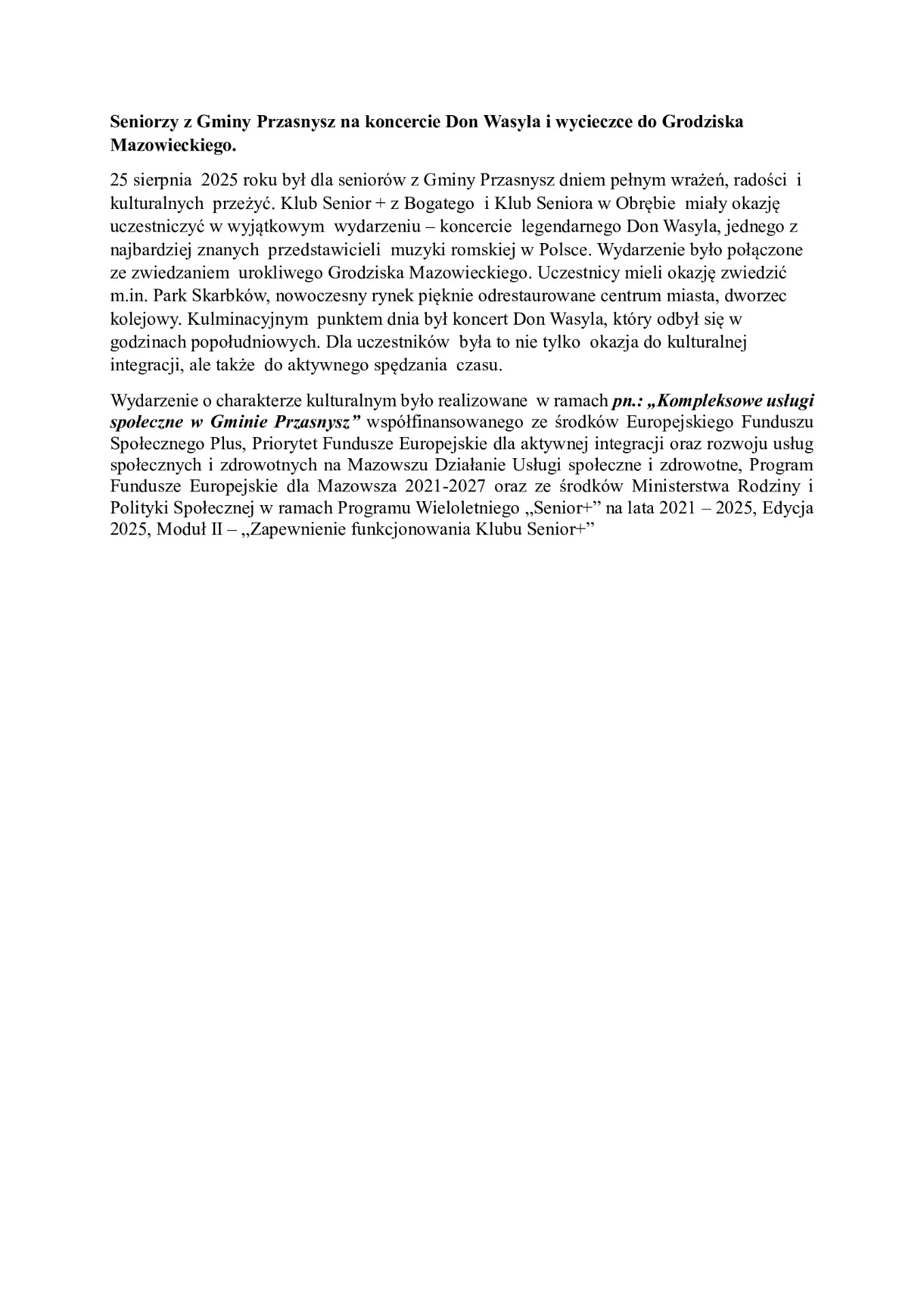 Seniorzy z Gminy Przasnysz na koncercie Don Wasyla i wycieczce do Grodziska Mazowieckiego.
