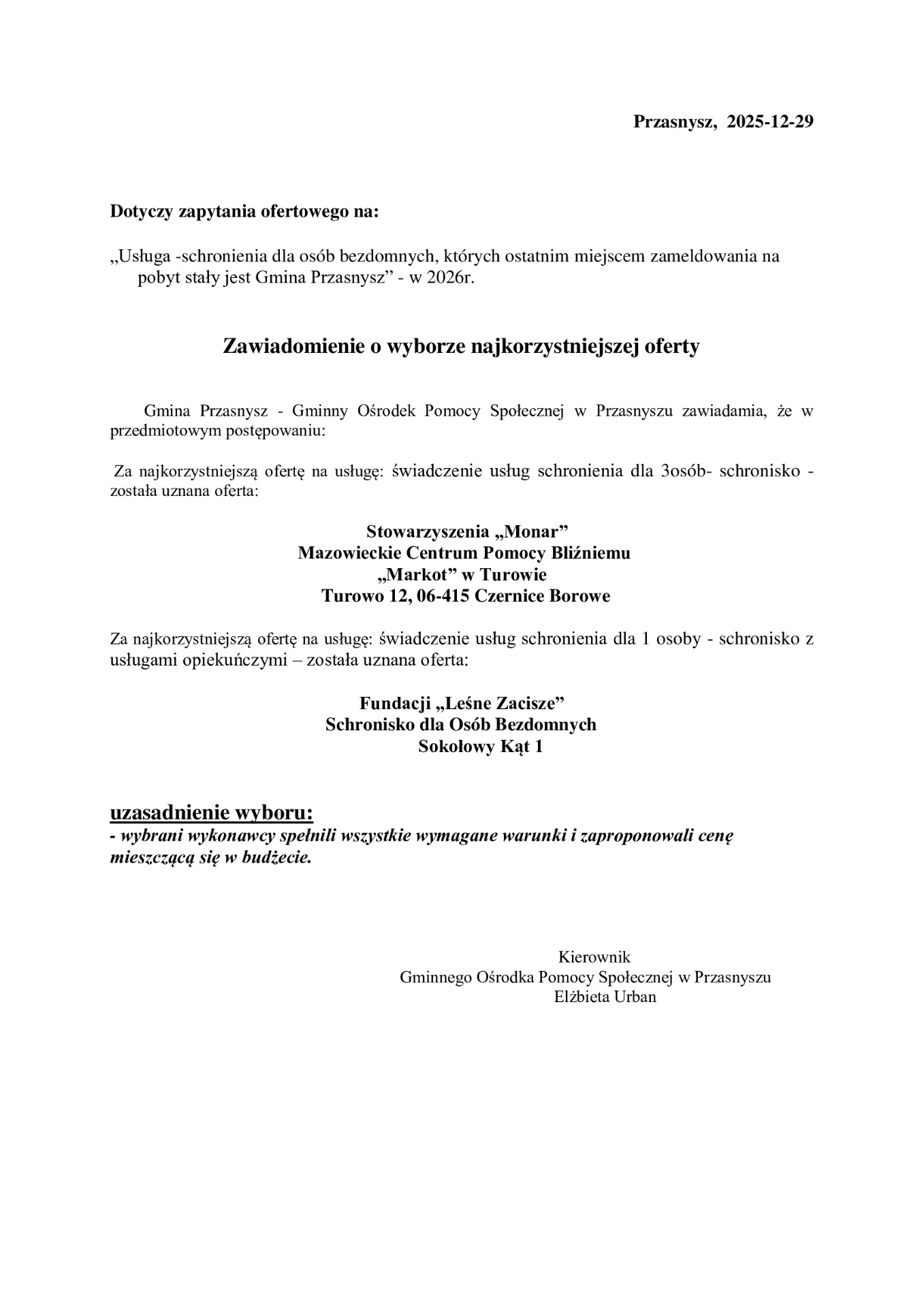 Zawiadomienie o wyborze najkorzystniejszej oferty schronienie dla osób bezdomnych